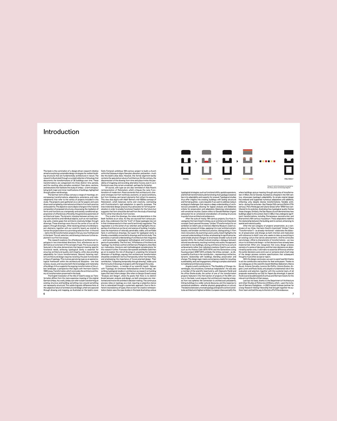 The book also includes several contributions that explore architectural typology, transformation and theoretical concepts. Andreas Lechner and Gennaro Postiglione discuss the "affordances of architectural typology", while Francesca Serrazanetti and Maike Gold examine "temporality through drawing". Victoria Easton explores "typology as an emotional rationalisation of the existing" and Eva Kuss analyses "Hermann Czech's 'Umbau' as an architectural-theoretical concept". Angelo Lunati looks at "assemblages, accumulations and contextual adaptations", while Hermann Czech contributes his famous work on "transformation" in architecture, thus opening the theoretical dialogue.