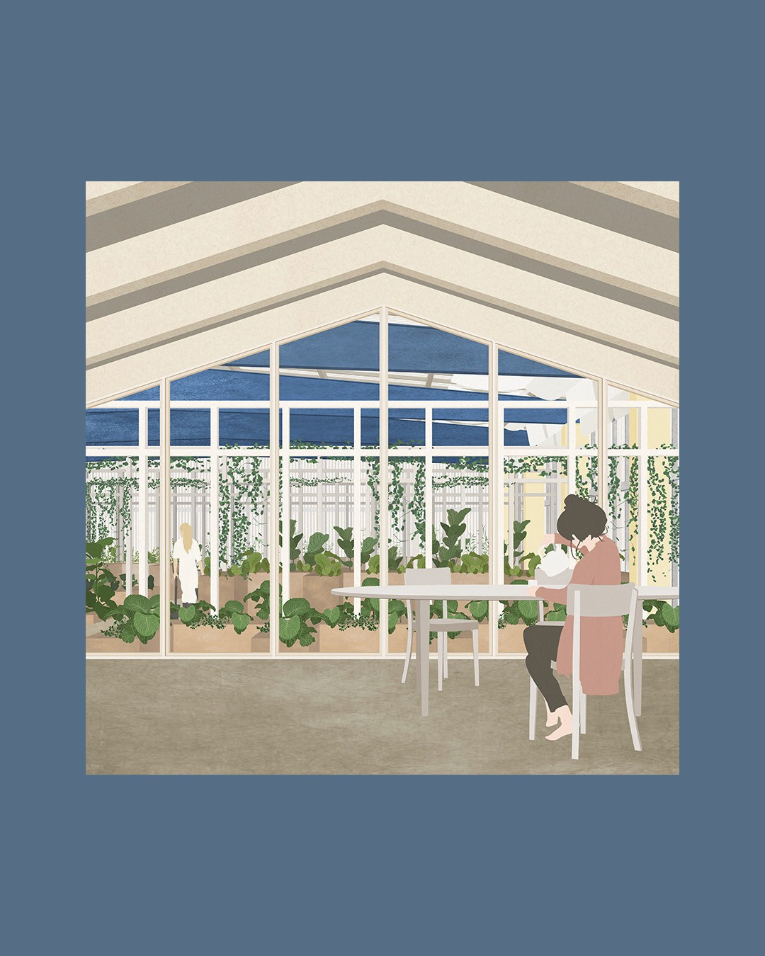 Conceptually, the design develops the “frame” as both structural principle and organisational logic: a layered framework spans the site, defines intermediate spaces, and forms a flexible system for cultivation, workshops, and communal programmes. Food education, seed-to-table routines, and a food-sharing point connect production with social value, while passive strategies—solar gain, natural ventilation, rainwater harvesting, and composting—support year-round use and underline the project’s ecological ambition.
