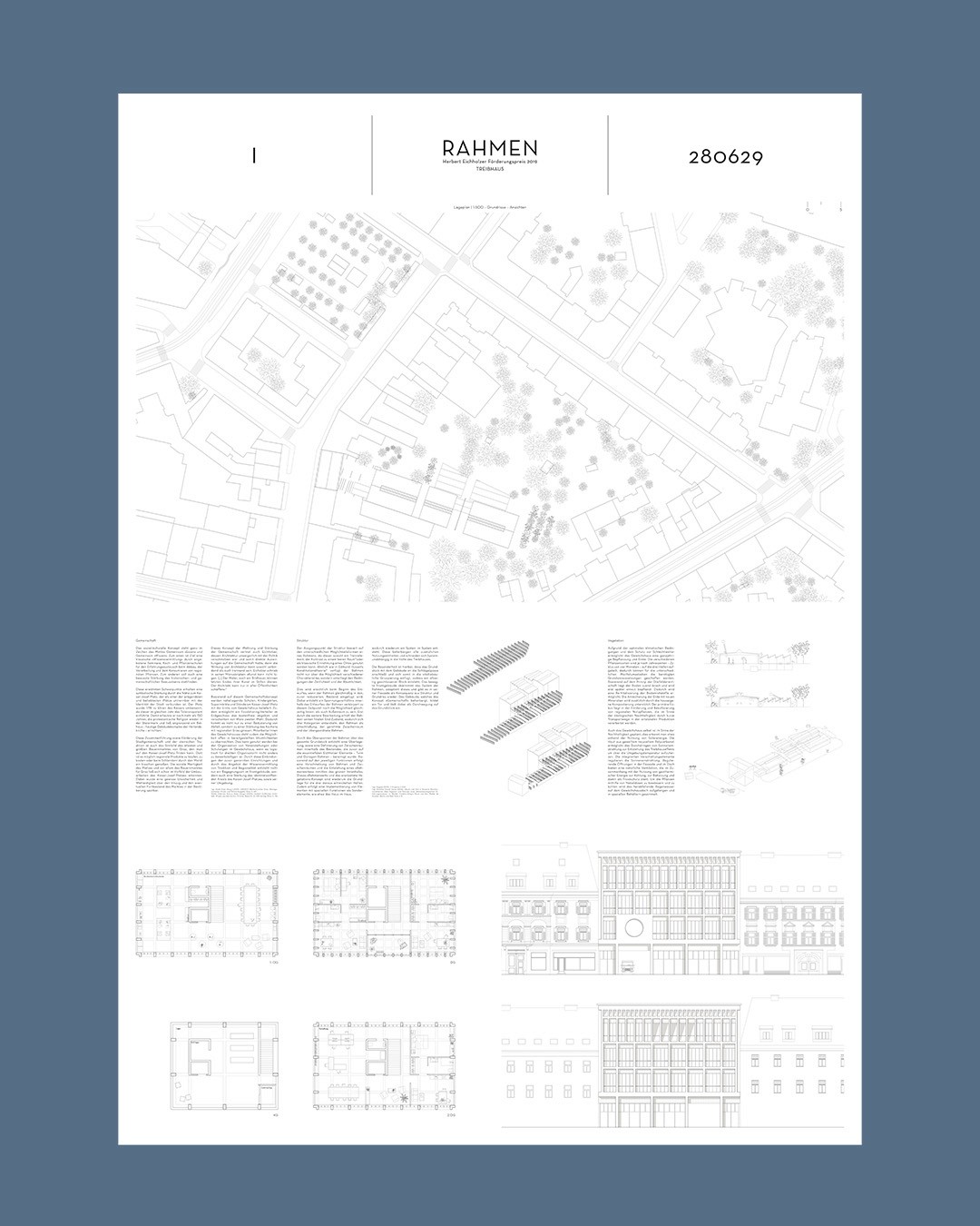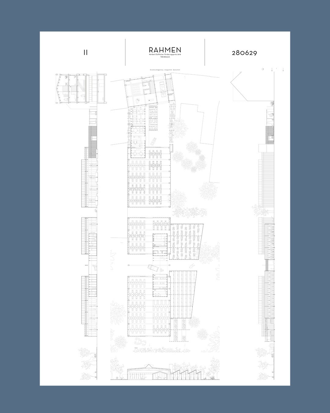 "Rahmen" was developed for the Herbert Eichholzer Architecture Award 2019 and takes the Opera Garage (1933) by Herbert Eichholzer and Rudolf Nowotny as its point of departure—an almost unchanged structure hidden in the courtyard of a Wilhelminian block in Schögelgasse, between Kaiser-Josef-Platz and Dietrichsteinplatz. Responding to the competition brief, the project reimagines the existing hall as a glazed greenhouse and proposes a new street-front building as a civic “third place” dedicated to food, learning, and exchange—rooted in the everyday culture of the nearby Kaiser-Josef-Markt.