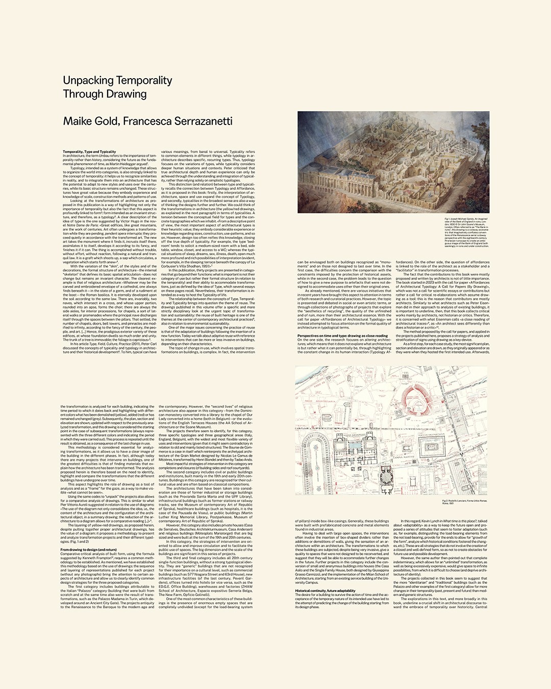 In this contribution, we explore the concept of drawing as not just a means of representation, but also as a temporal practice that shapes architectural thinking. We distinguish three dimensions: drawing as a time-based process involving iterations, corrections and overlays; drawing as a means of depicting time in architecture, such as construction phases, material ageing and shifting contexts; and drawing as a medium that shapes temporal perception by bridging past references, present decisions and future possibilities. We also consider the limitations of conventional orthographic projection in capturing change and discuss more sequential and dynamic modes of representation. By understanding drawing as a process rather than a product, we argue that design approaches can be grounded in transformation, adaptation, and reuse.