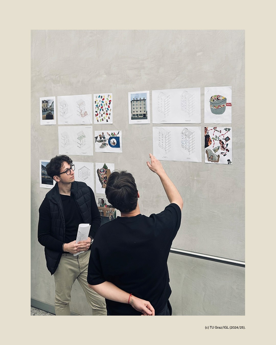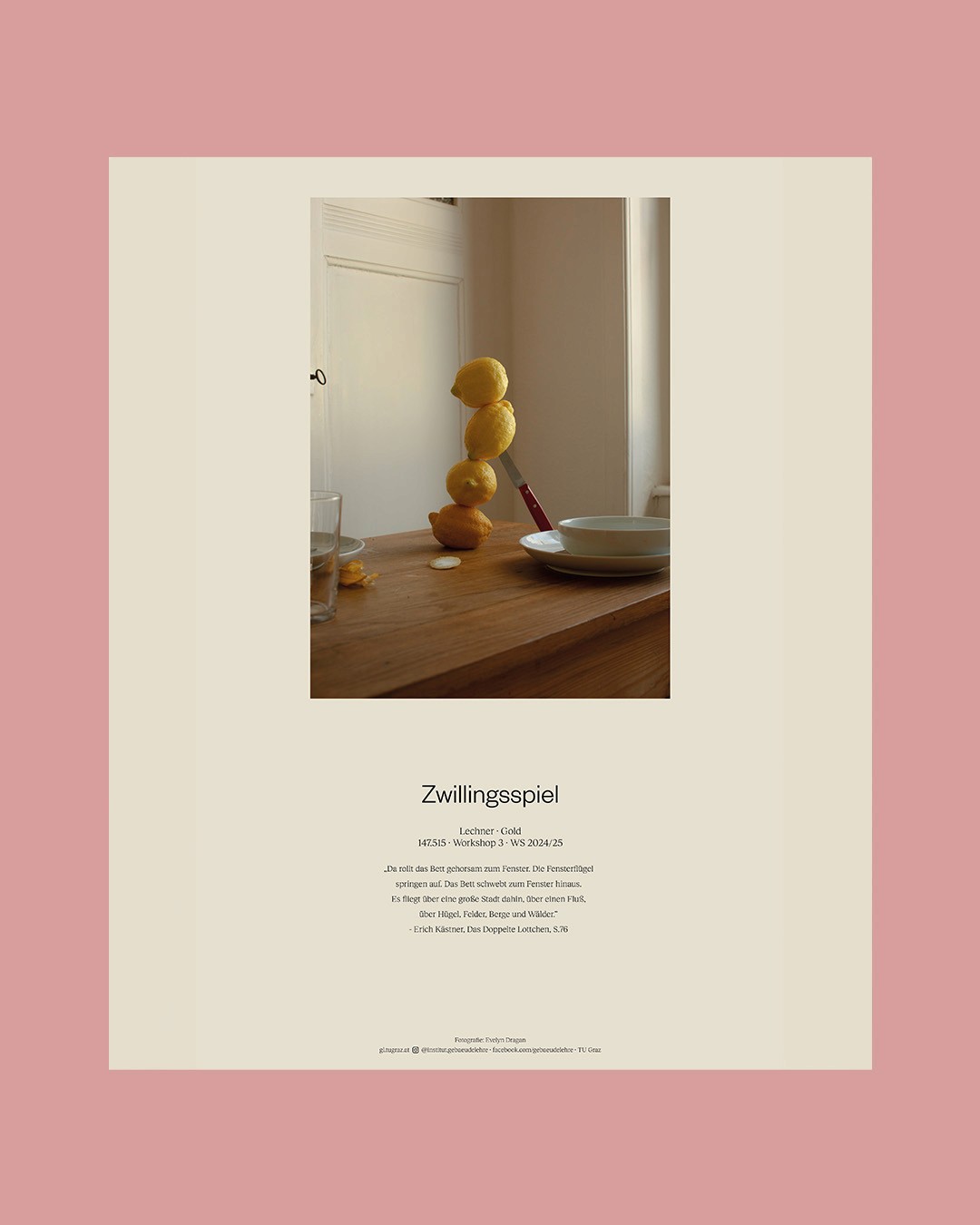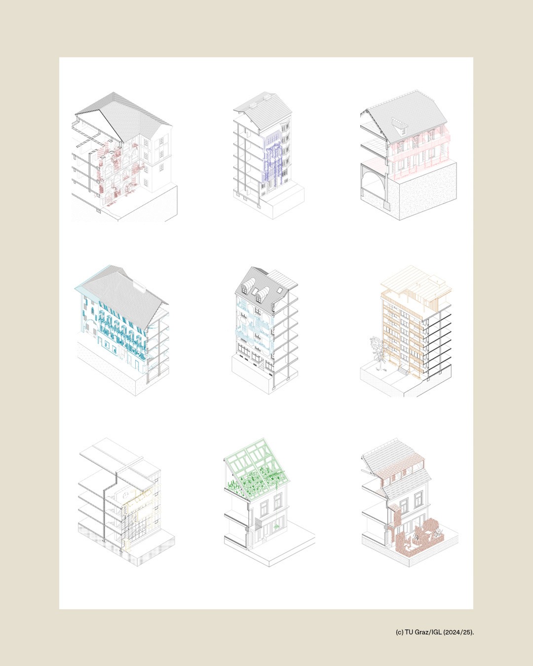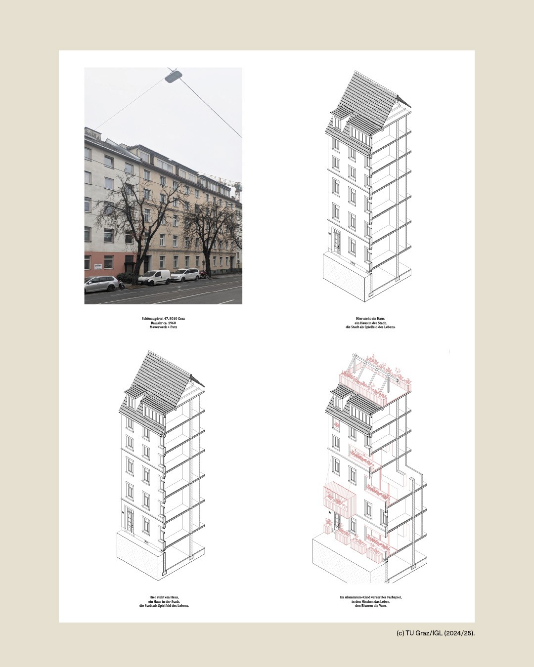 “Da rollt das Bett gehorsam zum Fenster …” (Erich Kästner) set the tone for Zwillingsspiel, a joint design workshop between TU Braunschweig and Graz University of Technology. Co-developed and coordinated with Prof. Andreas Lechner and Jasmin Moor, the studio linked two cohorts and perspectives through the idea of “twins” as a productive design lens—parallel concepts, mirrored constraints, and small shifts that generate radically different spatial outcomes. Set in the urban fabric of Graz, the workshop explored the relationship between façade and interior typology: students documented selected façades, decoded the underlying plan logics, and tested subtle variations through quick sketches and collages. The week culminated in an isometric sectional drawing that synthesised observation, typological reading, and transformation into one coherent representation.